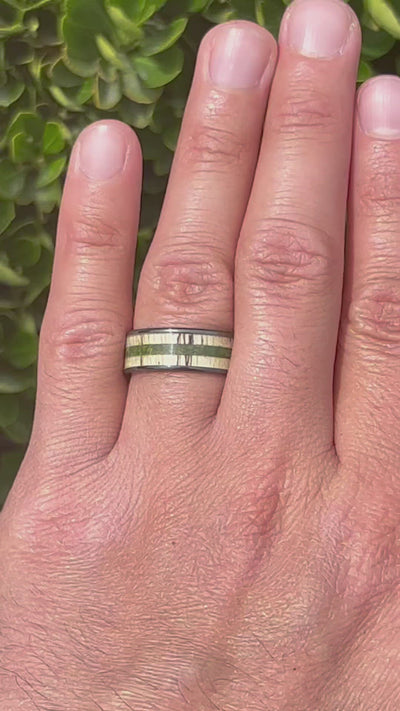 • Ring Style: "Rainier" is a handcrafted men's wedding ring featuring moss and spalted maple wood inlays