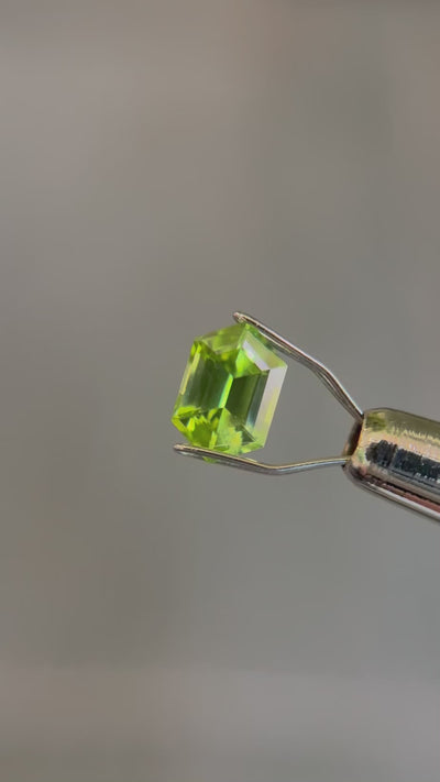 A hexagon cut green peridot, a gemstone that captures attention with its unique hue. This peridot is renowned for its captivating green color that evokes an image of a tropical vacation. The hexagon cut is known for its distinctive arrangement of facets, making it suitable for various types of jewelry, including rings, pendants, and earrings. If you're looking for a gem to create a truly unique ring, this is it!