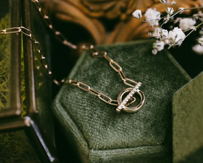 A beautiful, edgy, and contemporary design. A diamond toggle necklace features a distinctive closure mechanism in the form of a toggle clasp, and it is adorned with diamonds for a luxurious and elegant look. The toggle clasp is a unique feature that serves a functional purpose and adds a decorative element to the necklace. This piece is a symbol of love, commitment, and responsible choices, making it a meaningful and beautiful gift.