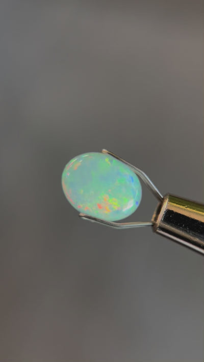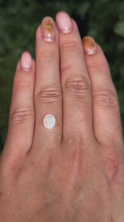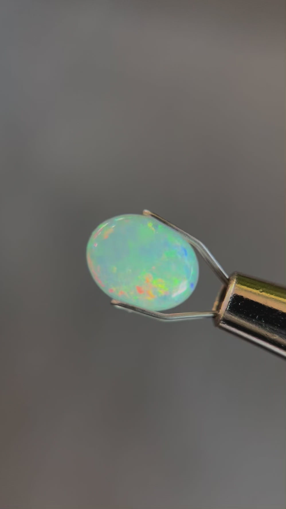 A mesmerizing gemstone renowned for its stunning play-of-color and clarity. Typically, crystal opals exhibit a transparent to semi-transparent body, allowing light to pass through and enhance the brilliance of the colors within. This particular opal showcases vibrant hues that can include reds, greens, blues, and yellows, often appearing as shifting patterns or flashes that dance across the surface. The oval cut