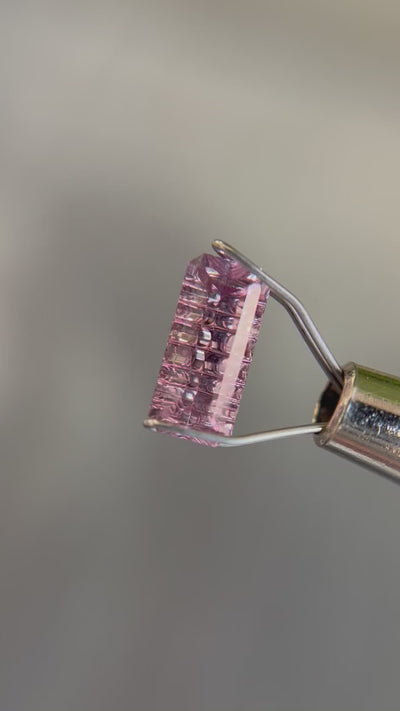 Fall in love with this one-of-a-kind Malaya Garnet. Found amidst the rugged landscapes of Tanzania, the gemstone's name, "Malaya," is derived from a Swahili word meaning "outcast". The distinct concave rectangle cut combines symmetry and brilliance that makes this gem dazzle in the sunlight. In natural light, it exhibits shades of lavender and pink, while under UV lighting, it shifts to richer tones of red. This gem would look perfect in both a simple and whimsical style ring!