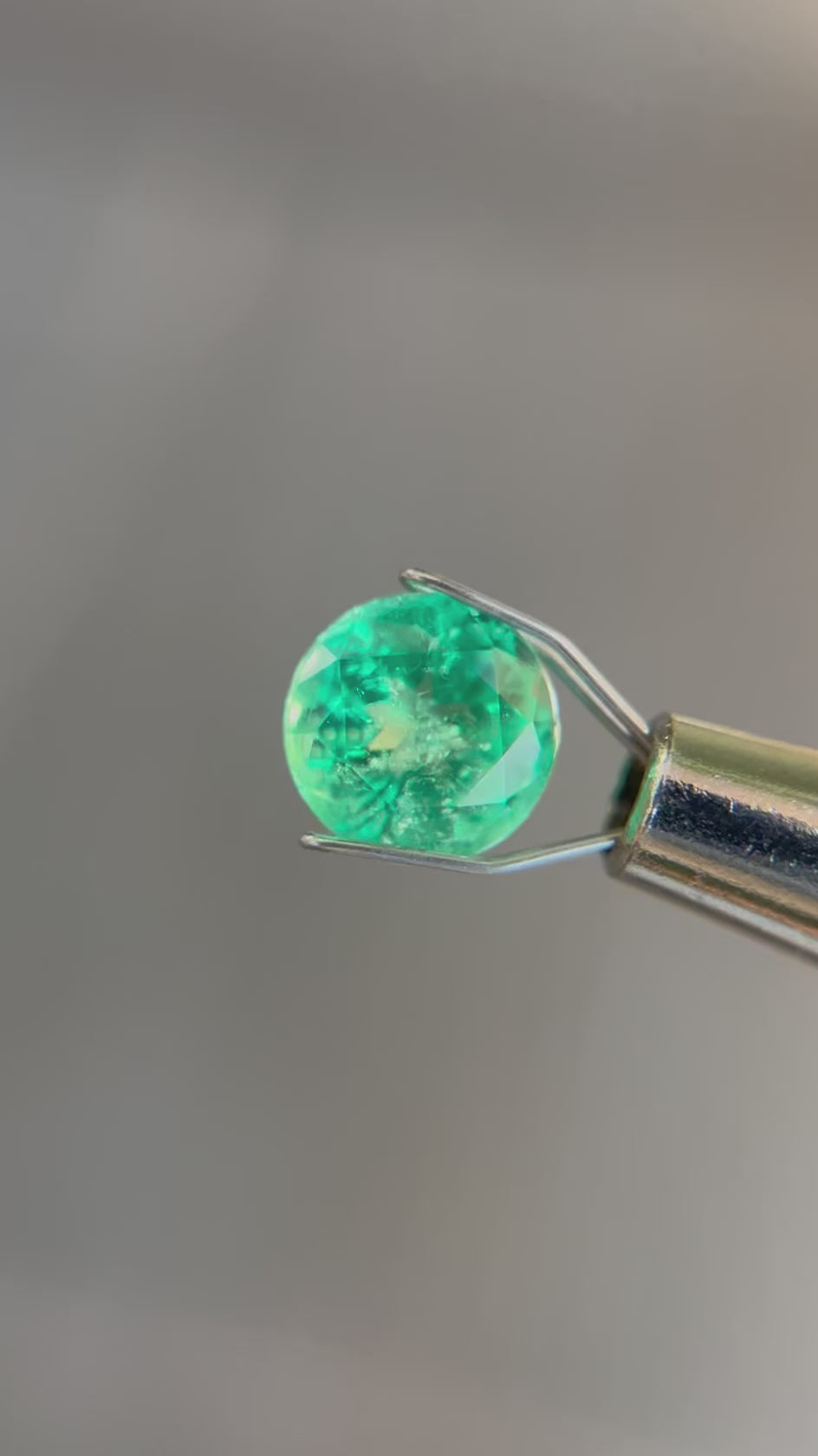 A one-of-a-kind emerald, a gemstone that captures attention with its vibrant green hue. The round brilliant cut enhances the gem's natural beauty, featuring a symmetrical arrangement of facets that maximizes its sparkle in the light. Emerald is cherished for its intense color and historical significance, being favored by Cleopatra herself, and is often associated with qualities like love and prosperity. This stone offers the classic elegance of an emerald combined with a dazzling cut that would look magical in any setting.