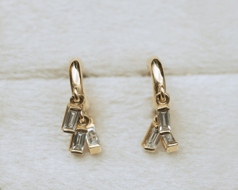 A pair of natural diamond baguette cut fringe hoop earrings. They are exquisite and luxurious pieces of jewelry designed to add a touch of elegance and sophistication to any outfit. These earrings are crafted using natural diamonds and high-quality 14K gold, ensuring ethical and sustainable sourcing while delivering the beauty and brilliance of traditional diamond jewelry. They are often chosen for various occasions, from casual outings to formal events.