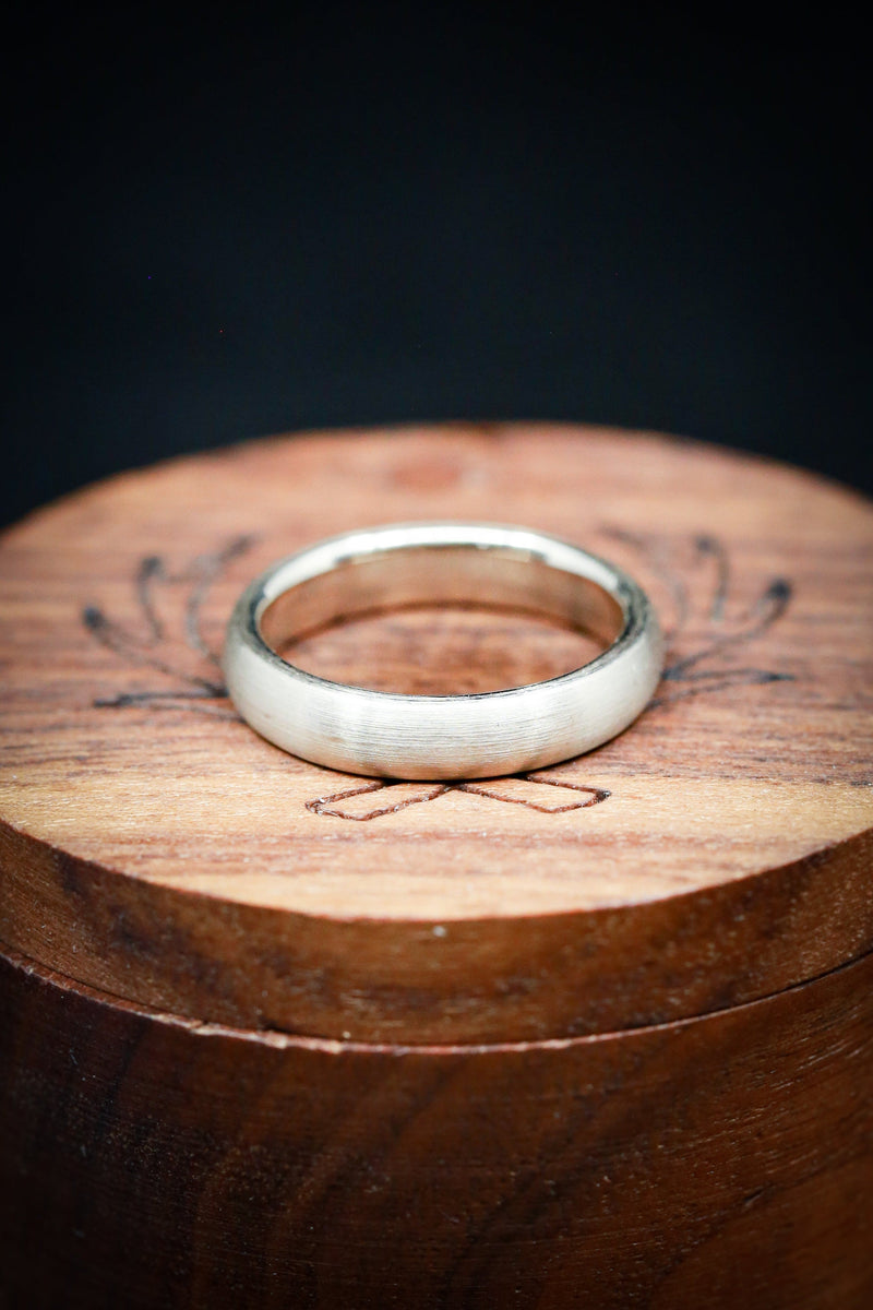 • Ring Style: A custom, handcrafted wedding band featuring a 14K white gold with a brushed finish. Additional inlay options are available upon request.