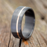 • Ring Style: A handcrafted men's wedding ring featuring a 14K rose gold inlay with a brushed finish