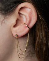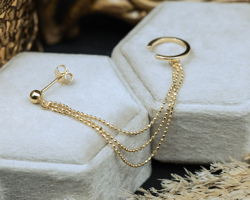 14K GOLD TRIPLE BEAD CHAIN DRAPE EARRINGS WITH EAR CUFF