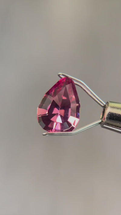 Most people think of deep red when they think of garnet, but this one-of-a-kind Mahenge garnet features a more pinkish-purple color and incredible dispersion. Originating from the Mahenge region of Tanzania, this rare and captivating stone is prized for its vivid, glowing color. The pear cut enhances the stone's natural beauty, featuring a symmetrical arrangement of facets that maximize its brilliance and sparkle. Whether set in an engagement ring, necklace, or pair of earrings, this gem is a bold and stunning choice for those who love vibrant color and extraordinary sparkle.
