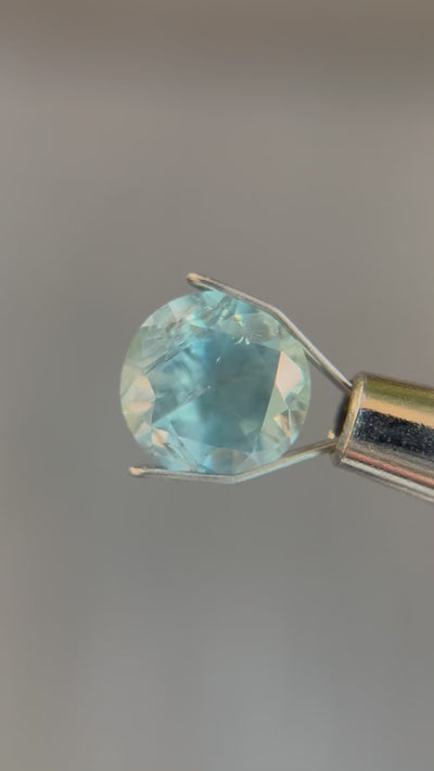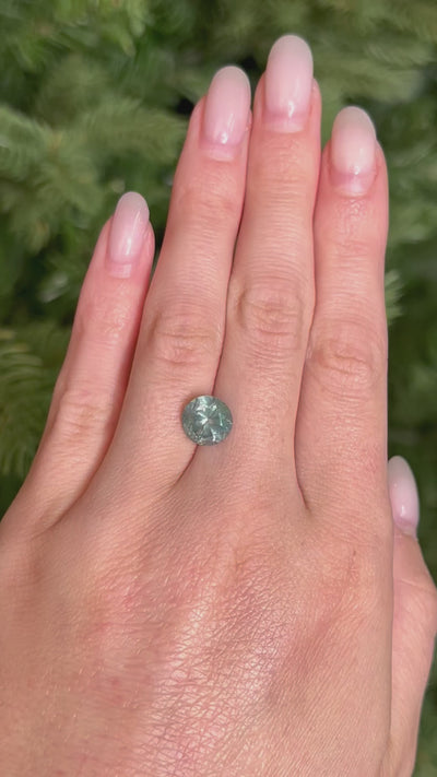 A round brilliant-cut green Montana sapphire, a gemstone that captures attention with its unique and vibrant hue. This sapphire is renowned for its captivating green color that resembles a tropical vacation. The round brilliant cut enhances the sapphire's natural beauty, featuring a symmetrical arrangement of facets that maximize its brilliance and sparkle.