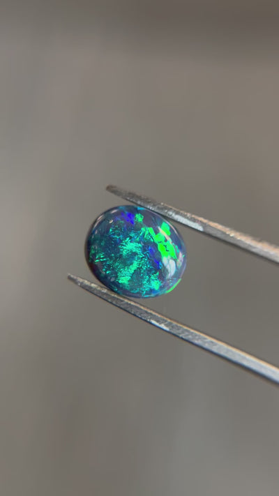 A stunning black opal mined in Australia that displays gorgeous green and teal play-of-color. This incredible color phenomenon is caused by small silica spheres within the structure of the gem diffracting light. Play of color can include every color in the rainbow, although some colors, like green and blue, are more common than red. The size of the spheres within the opal will help determine the color it flashes - small spheres reflect blue, while larger spheres reflect red. Black opals are not necessarily black stones; they are named after their relatively dark body color. Black opal is the most prized variety of opal in the world.