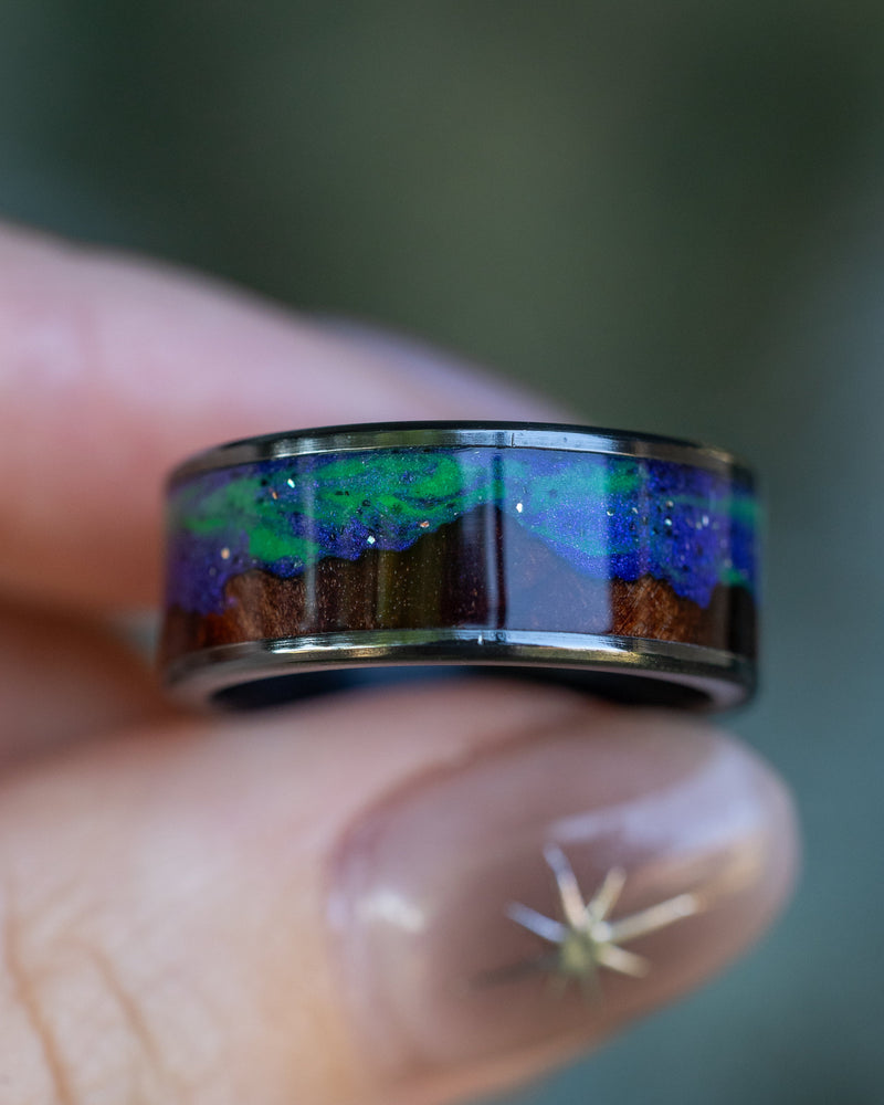 "BOREALIS" - MOUNTAIN ENGRAVED WEDDING RING WITH REDWOOD & GLOW IN THE DARK NORTHERN LIGHTS - BLACK ZIRCONIUM - SIZE 6 1/2