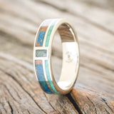 • Ring Style: "Bower" is a custom, handcrafted men's wedding ring featuring a patina copper, malachite, and moss agate inlays