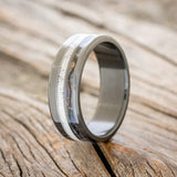 • Ring Style: "Cosmo" is a custom, handcrafted men's wedding ring featuring an elk antler and paua shell inlays offset into two channels. Additional inlay options are available upon request.