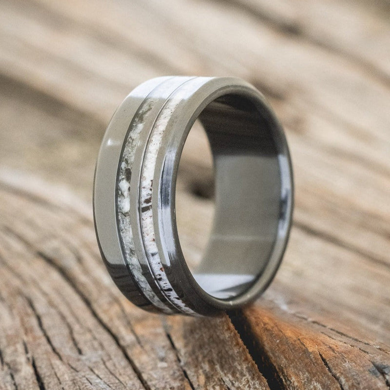 • Ring Style: "Cosmo" is a custom, handcrafted men's wedding ring featuring moonstone and antler inlays. Additional inlay options are available upon request.