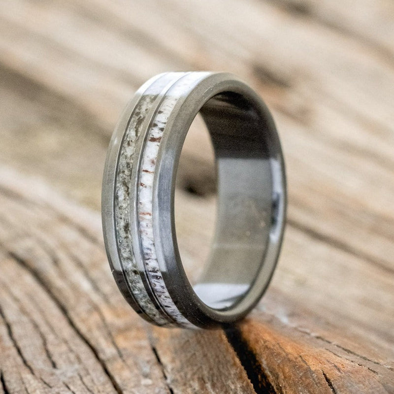 • Ring Style: "Cosmo" is a custom, handcrafted men's wedding ring featuring moonstone and antler inlays