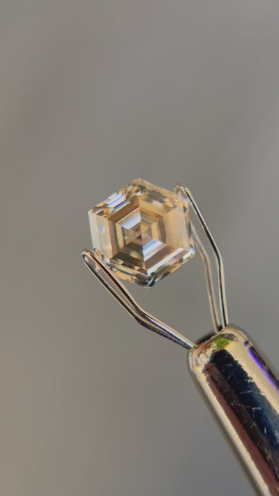 "Cuvée" is a unique hexagon-cut champagne diamond with a light champagne color that was mined from the Gahcho Kue mine in Canada. This stunning stone is a statement piece that will make any engagement ring stand out. The combination of the subtle color and the alluring cut make this gem a perfect find!