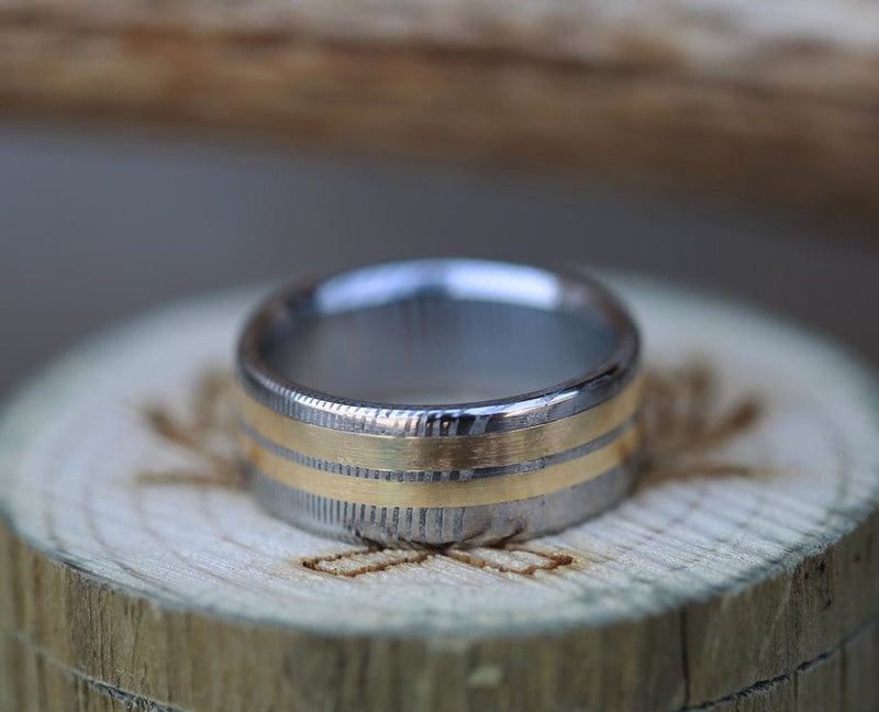 • Ring Style: A custom, handcrafted men's wedding ring featuring 2 wide yellow gold inlays, shown here on a Damascus steel band. Additional inlay options are available upon request.