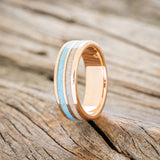 • Ring Style: "Dyad" is a custom, handcrafted men's wedding ring featuring 2 channels with fire and ice opal and turquoise inlays