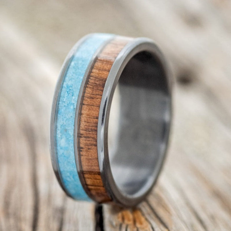 • Ring Style: "Dyad" is a custom, handcrafted men's wedding ring featuring 2 channels with koa wood and hand-crushed turquoise inlays. Additional inlay options are available upon request.