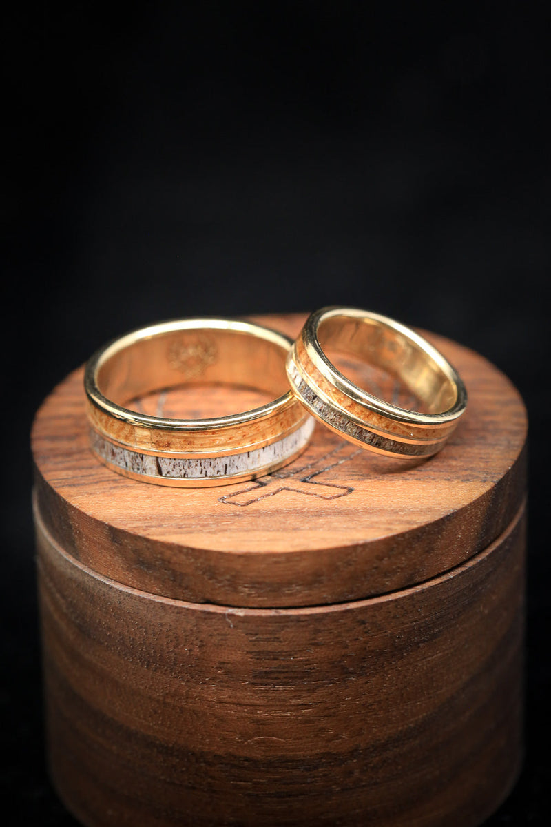 "DYAD" - MATCHING SET OF ANTLER & WHISKEY BARREL WOOD WEDDING BANDS