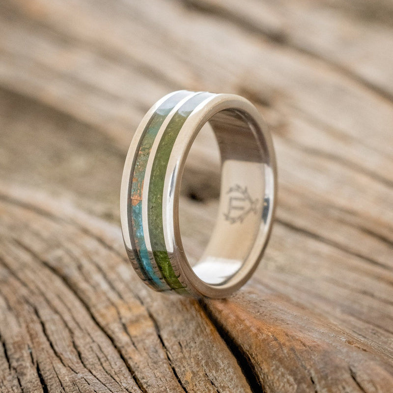 • Ring Style: "Dyad" is a custom, handcrafted men's wedding ring featuring 2 channels with moss & patina copper inlays. Additional inlay options are available upon request.