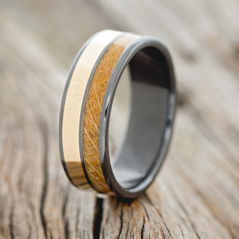 "DYAD" - WHISKEY BARREL OAK & 14K GOLD INLAY WEDDING BAND