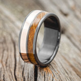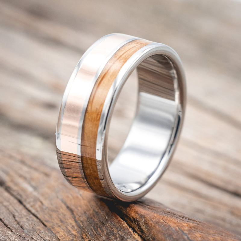 • Ring Style: "Dyad" is a custom, handcrafted men's wedding ring featuring 2 channels with 14K gold and whiskey barrel oak inlays