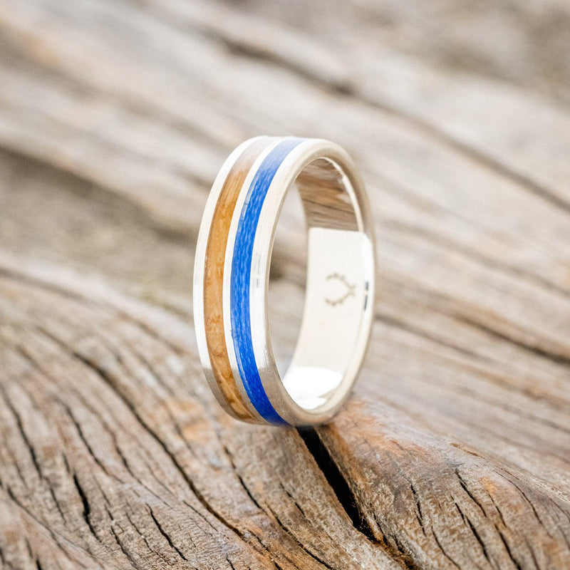 • Ring Style: "Dyad" is a custom, handcrafted men's wedding ring featuring 2 channels with whiskey barrel oak & blue fishing line inlays in a brushed finish. Additional inlay options are available upon request.
