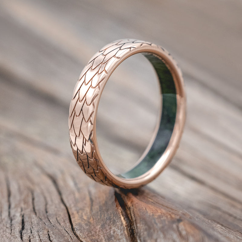 • Ring Style: "Echo" is a handcrafted, custom embossed men's wedding ring featuring a dragon scale engraving with a moss lining. It can be customized to feature just about any embossed design you can dream up.