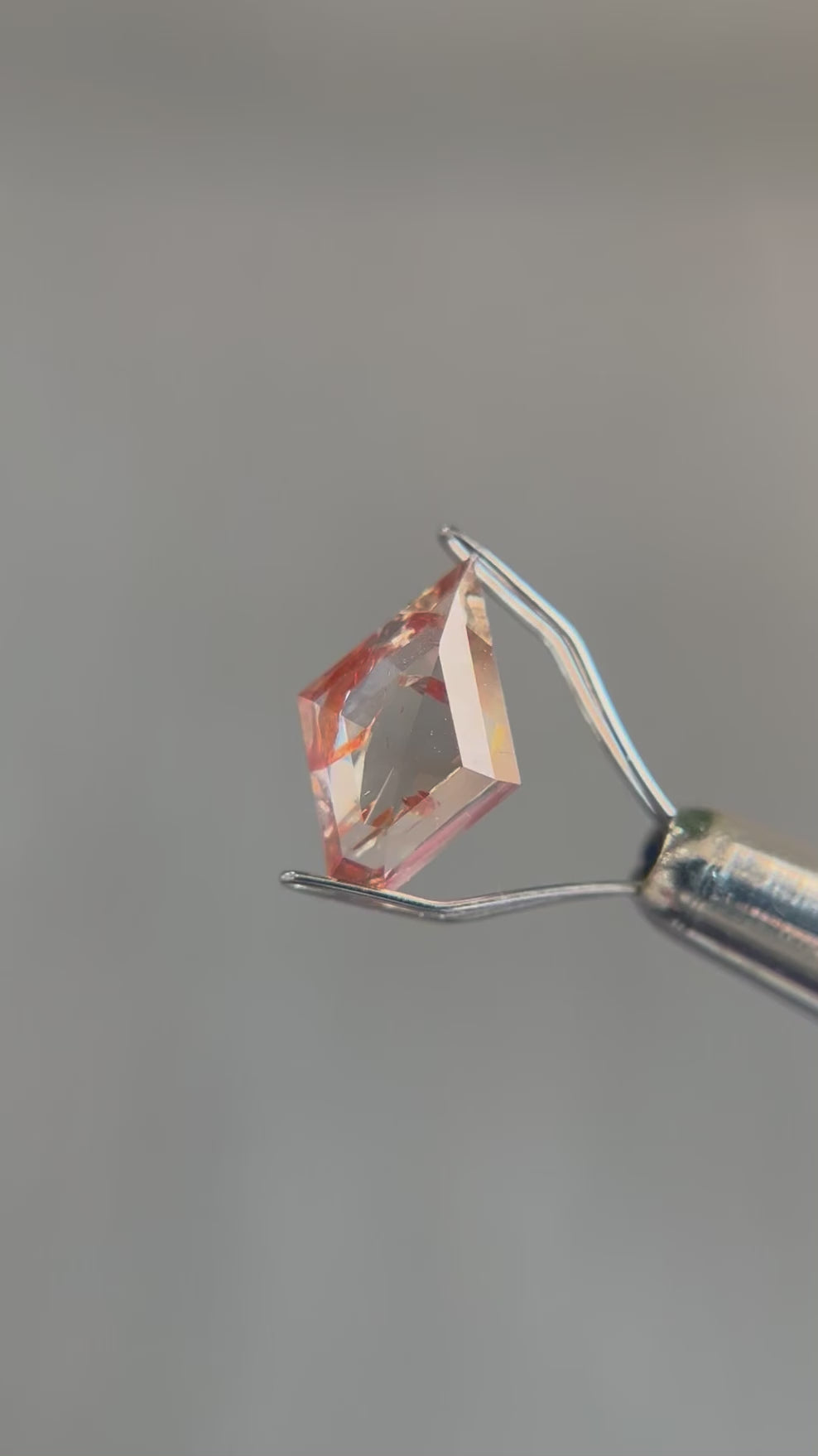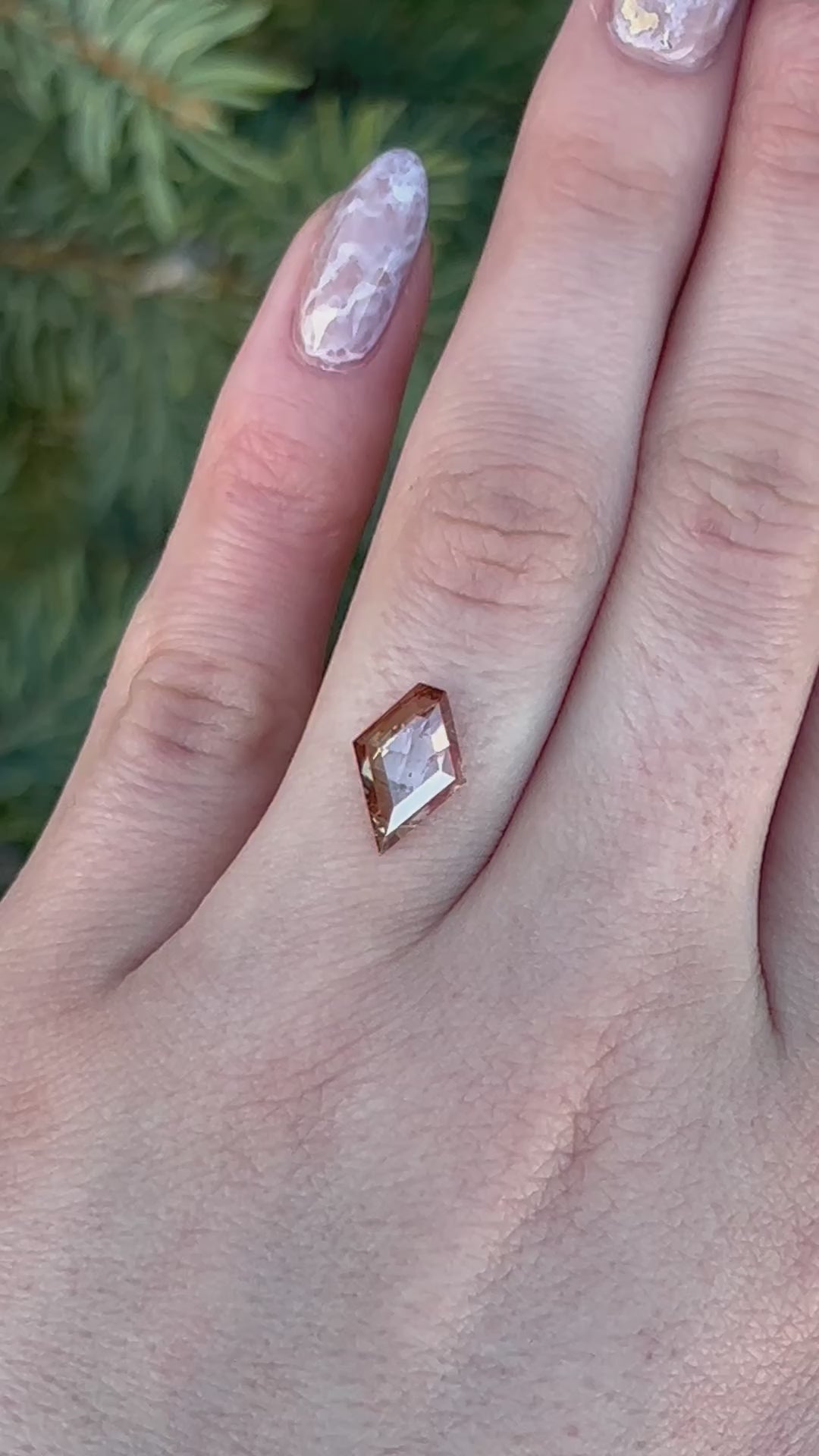 This stone features a kite double cut with breathtaking translucency and clarity that is interrupted by bronze inclusions. This calico diamond is ethically-sourced and conflict-free.