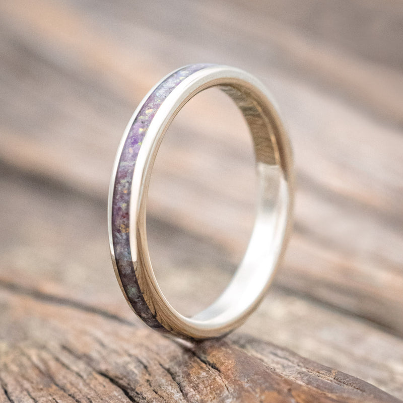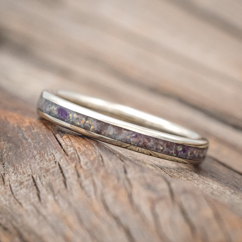 • Ring Style: "Eterna" is a custom, handcrafted women's stacking band featuring a sugilite inlay mixed with fire & ice opal