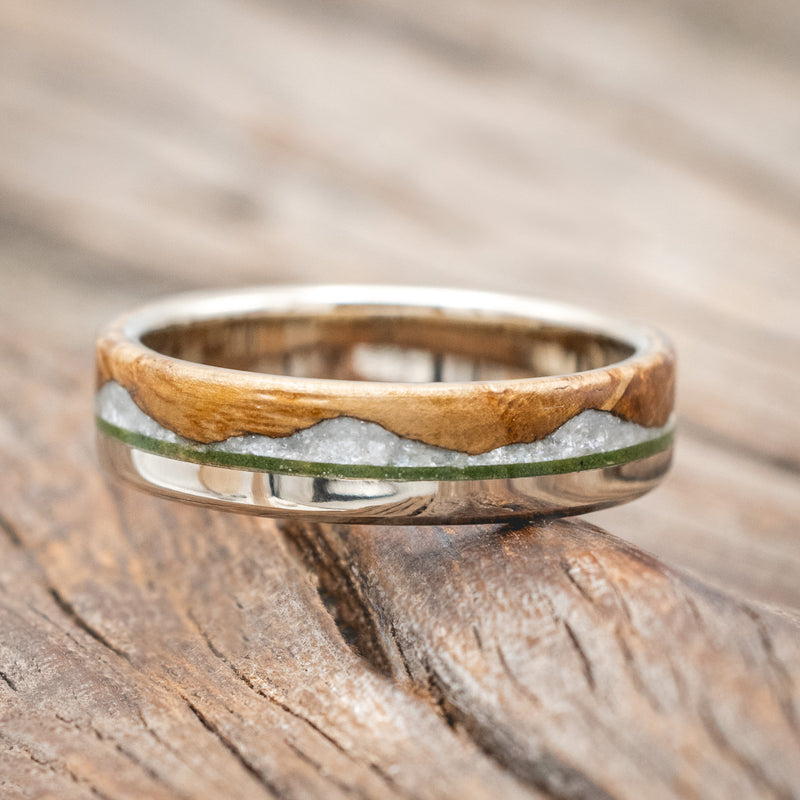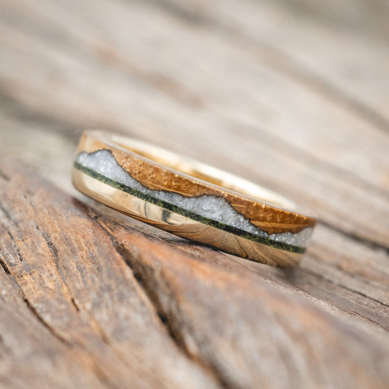 • Ring Style: "Ezra" is a custom, handcrafted men's mountain wedding ring featuring a whiskey barrel oak overlay with diamond dust and moss inlay