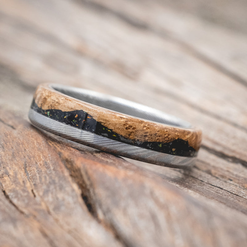 • Ring Style: "Ezra" is a custom, handcrafted men's mountain wedding ring featuring a whiskey barrel oak overlay with jet stone and fire and ice opal mix