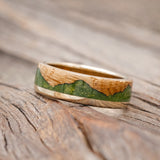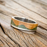 • Ring Style: "Ezra" is a custom, handcrafted men's mountain wedding ring featuring a whiskey barrel oak overlay with moss inlay