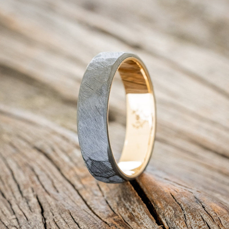 • Ring Style: A handcrafted men's wedding ring featuring a faceted black zirconium wedding band with a 14K gold lining. Additional inlay options are available upon request.