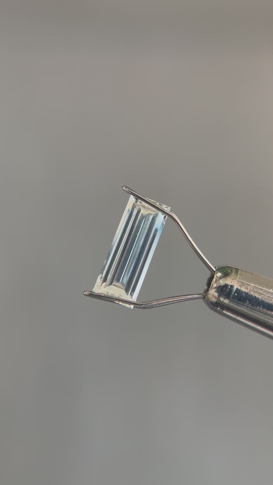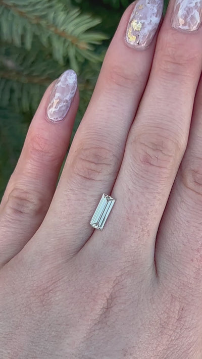"Genesis" is a beautiful baguette step-cut diamond showcasing VS2 clarity and I color. Its step-cut gives it a hall-of-mirrors effect that bounces light in an entrancing and unique way compared to a traditional brilliant cut stone. "Genesis" would be beautiful as a standalone stone or in a "toi et moi" setting.