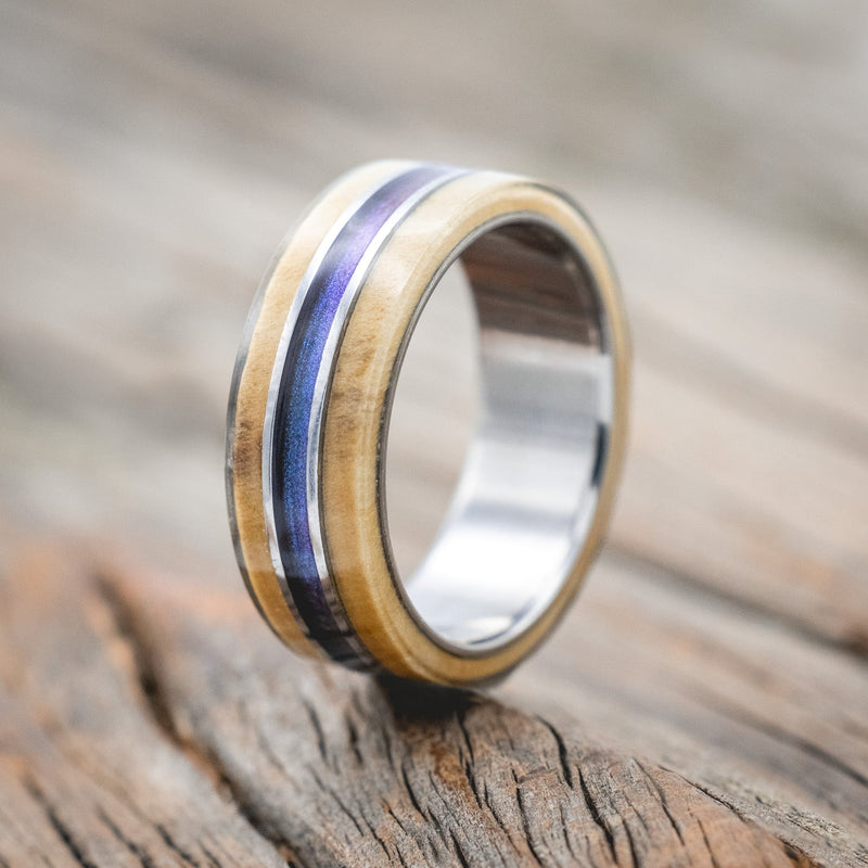 • Ring Style: "Glen" is a custom, handcrafted men's wedding ring featuring a buckeye burl wood overlay and a cosmic acrylic inlay. Additional inlay options are available upon request.