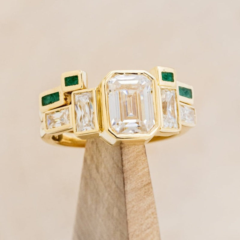 "GRETA" - BEZEL SET EMERALD CUT MOISSANITE ENGAGEMENT RING WITH MALACHITE STACKING BAND