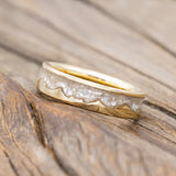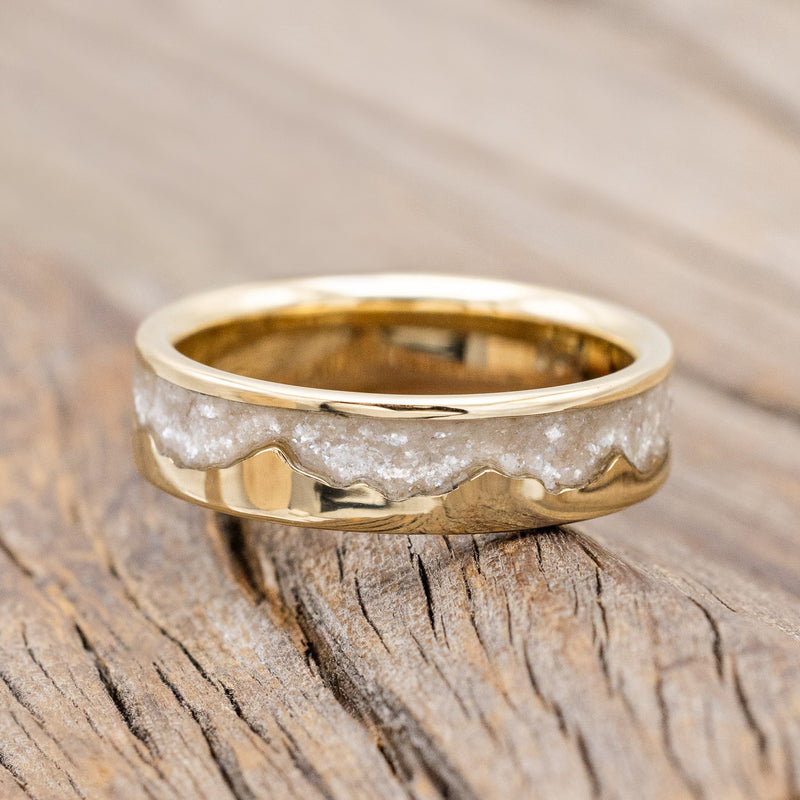 • Customizable: Because each ring is handcrafted to order, we can customize yours using unique materials, gemstones, or design features. We can even use personal materials that you send! Basic customizations, like swapping the crushed material for another crushed material, can be accommodated by adding a request in the “Custom Requests” section during checkout. For more extensive customizations, please contact us prior to purchase. We would be honored to make your ring even more meaningful! Custom mountain range engravings are available starting at a $350 customization fee.