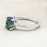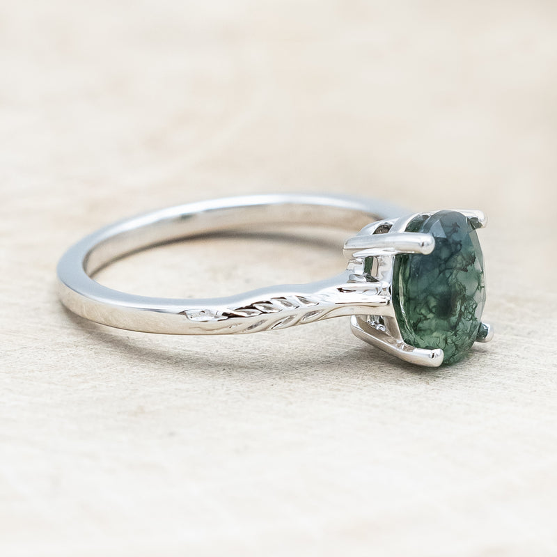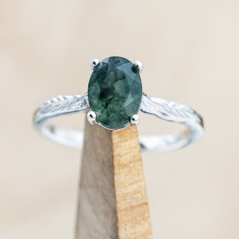 "HOPE" - OVAL CUT MOSS AGATE SOLITAIRE ENGAGEMENT RING WITH FEATHER ACCENTS