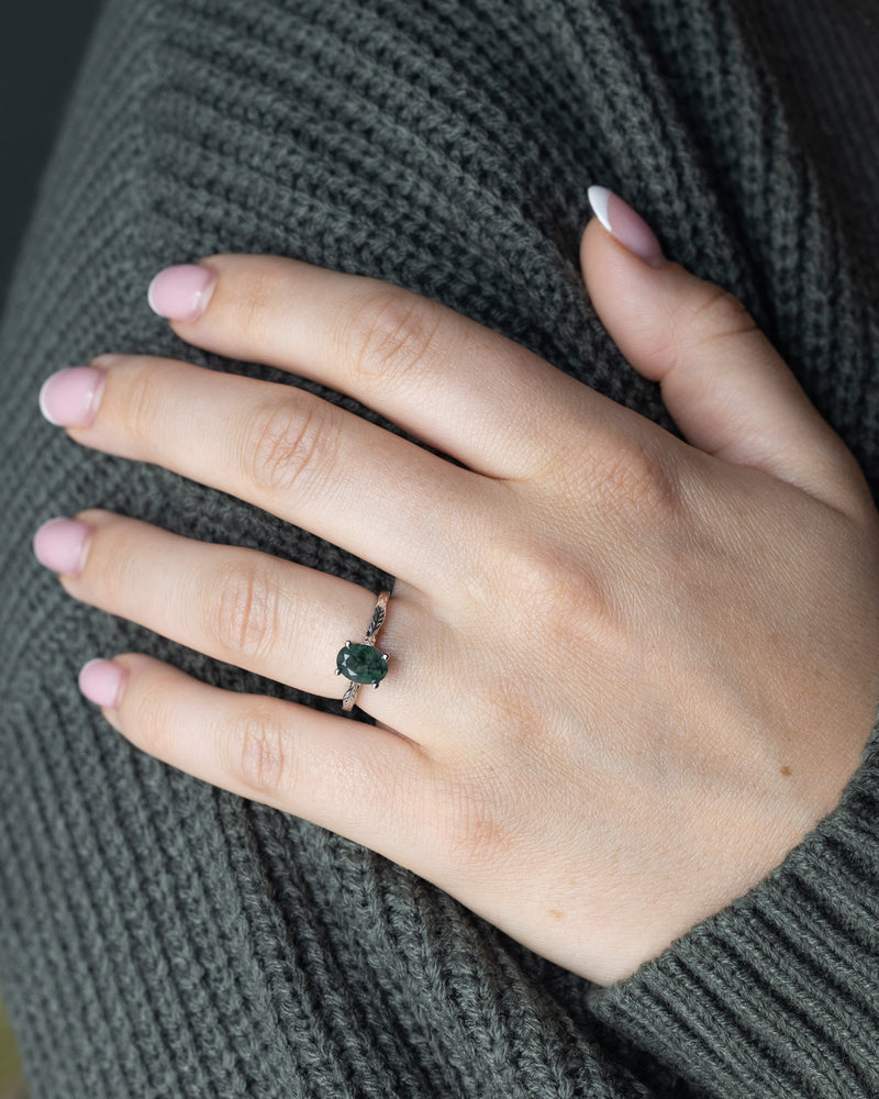 • Ring Style: The "Hope" is a solitaire-style moss agate women's engagement ring with feathered details
