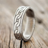 • Ring Style: "Link" is a custom, handcrafted men's wedding ring featuring a chain engraving on a titanium band. It can be customized to feature just about any engraving design you can dream up.