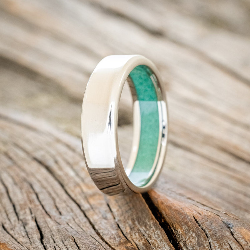 • Ring Style: A custom, handcrafted men's wedding ring featuring a hand-turned wedding band lined with malachite
