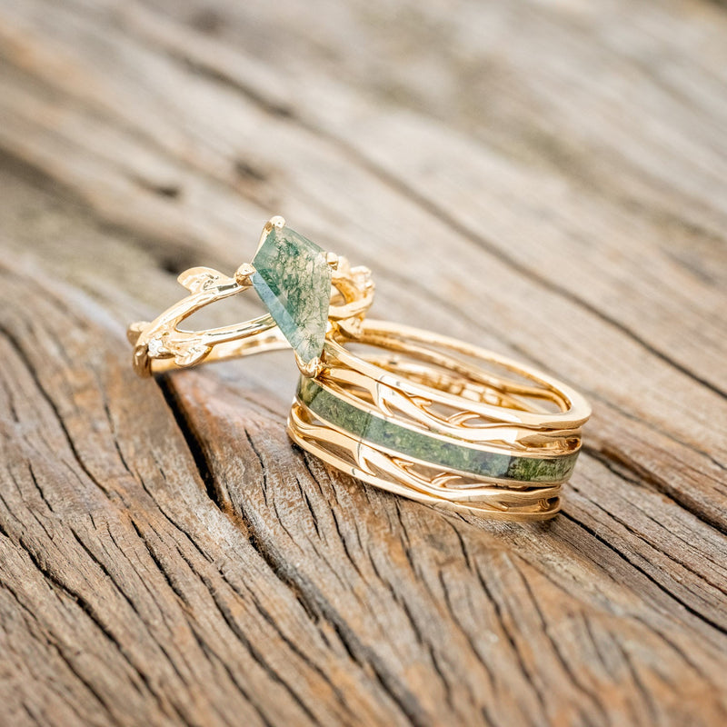 • Ring Style: A matching set of "Artemis On The Vine" & "Artemis" wedding rings. "Artemis" features a moss inlay. Additional inlay options are available upon request. "Artemis On The Vine" is a moss agate engagement ring with diamond accents