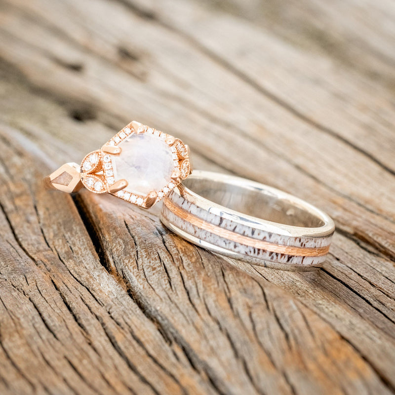 MATCHING SET OF "LUCY IN THE SKY" FACETED HEXAGON MOONSTONE & "DYAD" ANTLER INLAY WEDDING RINGS