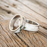 • Ring Style: Matching wedding band set featuring "Rainier." "Rainier" is a handcrafted wedding band featuring antler & moss inlay.