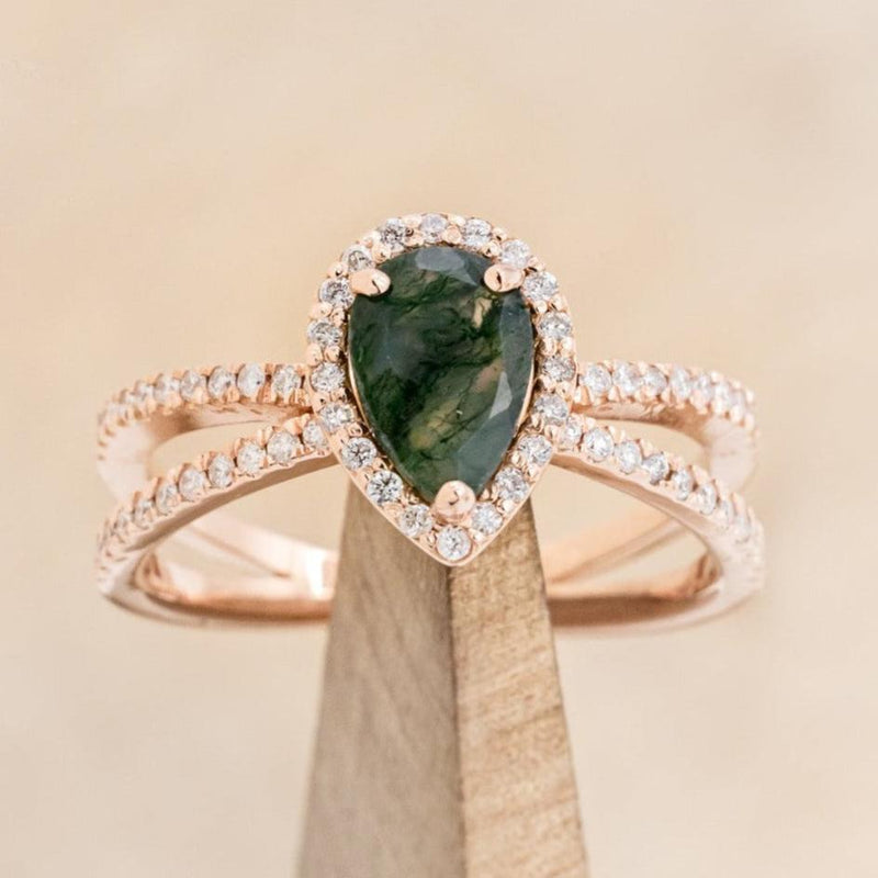 • Ring Style: "Nala" is a split shank-style pear cut women's engagement ring with a diamond halo and accents