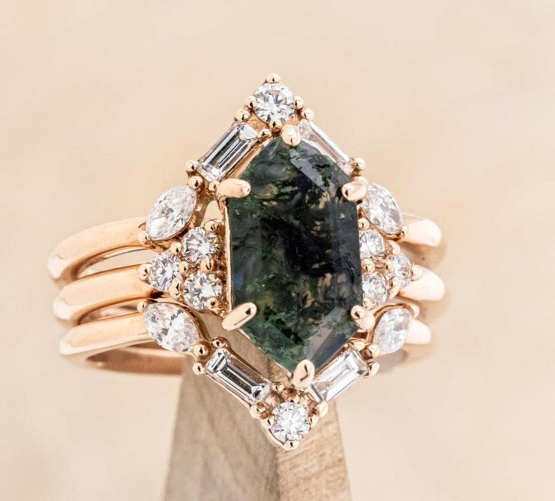 "OCTAVIA" - BRIDAL SUITE - ELONGATED HEXAGON CUT MOSS AGATE ENGAGEMENT RING WITH DIAMOND ACCENTS & "MELODY" TRACERS