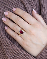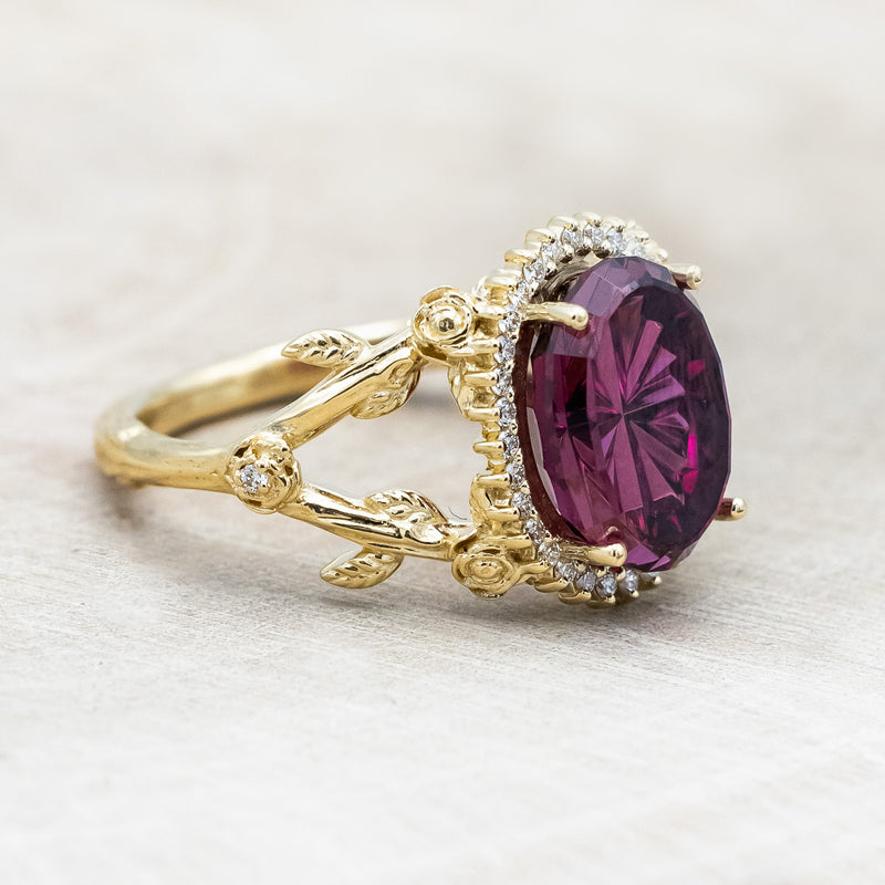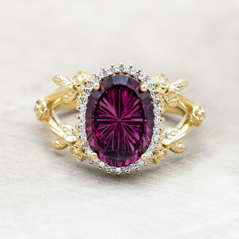• Ring Style: This is a one-of-a-kind oval garnet women's engagement ring featuring diamond accents on a 14K yellow gold band with rose accents