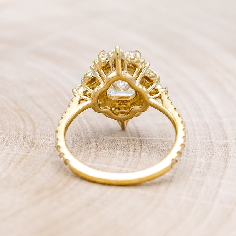 • Ring Style: The "North Star" is a one-of-a-kind emerald cut diamond women's engagement ring with a diamond halo and accents on a 14K yellow gold band