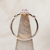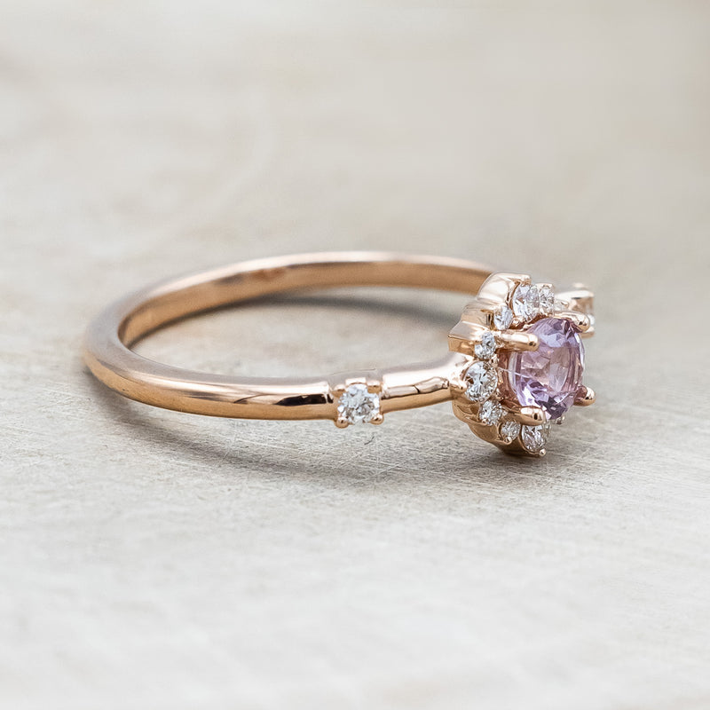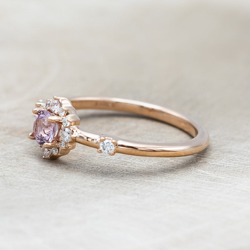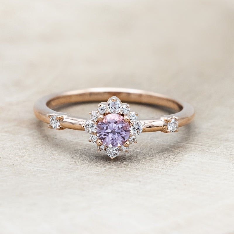 • Ring Style: This "Starla" is a one-of-a-kind dragon garnet women's engagement ring with a starburst diamond halo on a 14K rose gold band